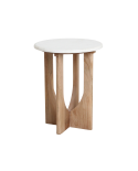 Son plateau rond en marbre repose sur un piètement en bois ouvert au design géométrique, offrant une allure à la fois légère et moderne.